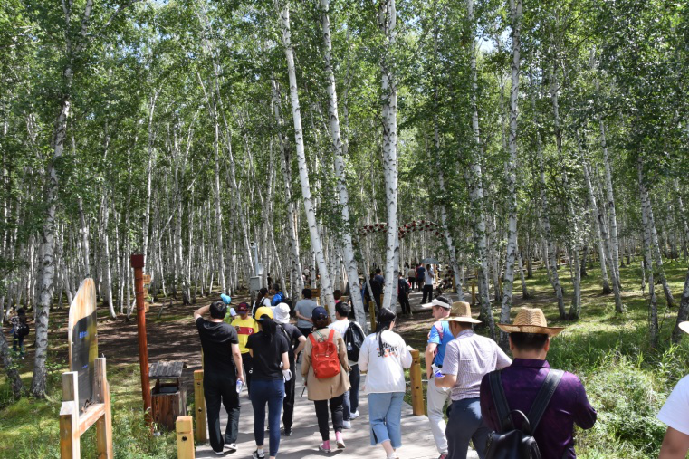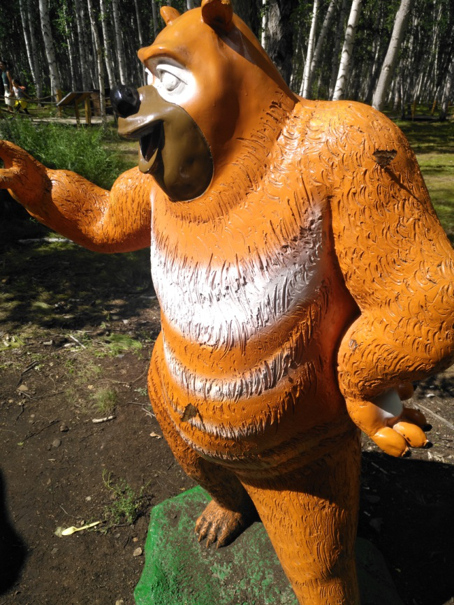咦,熊二?哈,你沒看錯,在這片白樺林里還藏著光頭強的家,熊出沒的故事在這里得到完美的演繹。瞧,熊二肚子上,膀子上還有蝴蝶在翩翩起舞,同行的孩子說是因為熊二蜂蜜偷吃多了,所以把蝴蝶都招來了。呃,好吧,我的娃兒,還是你的想象力夠豐富。