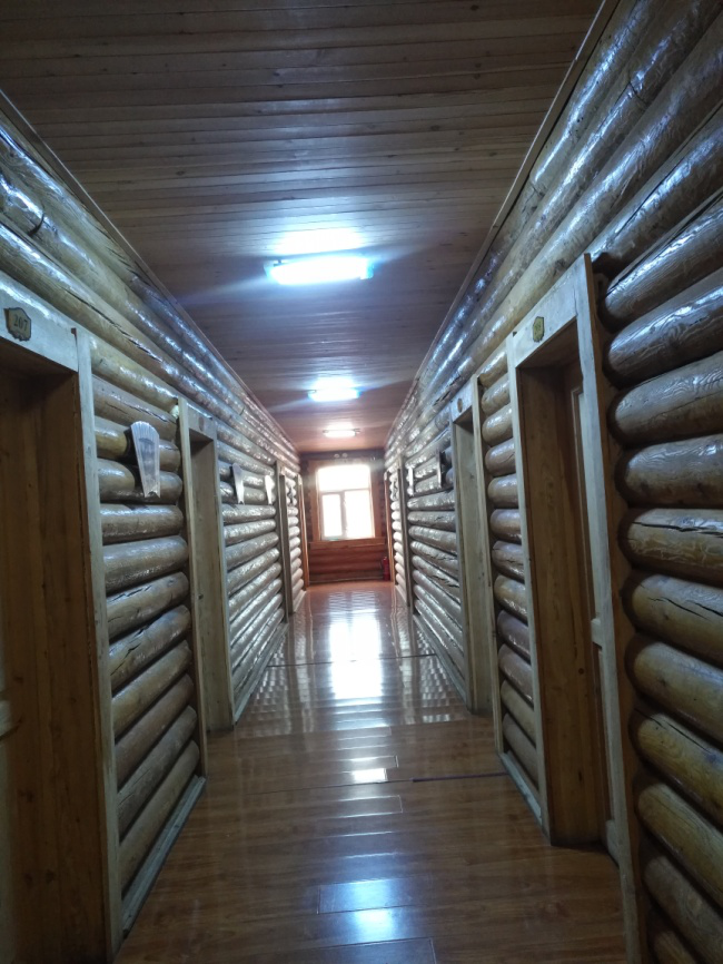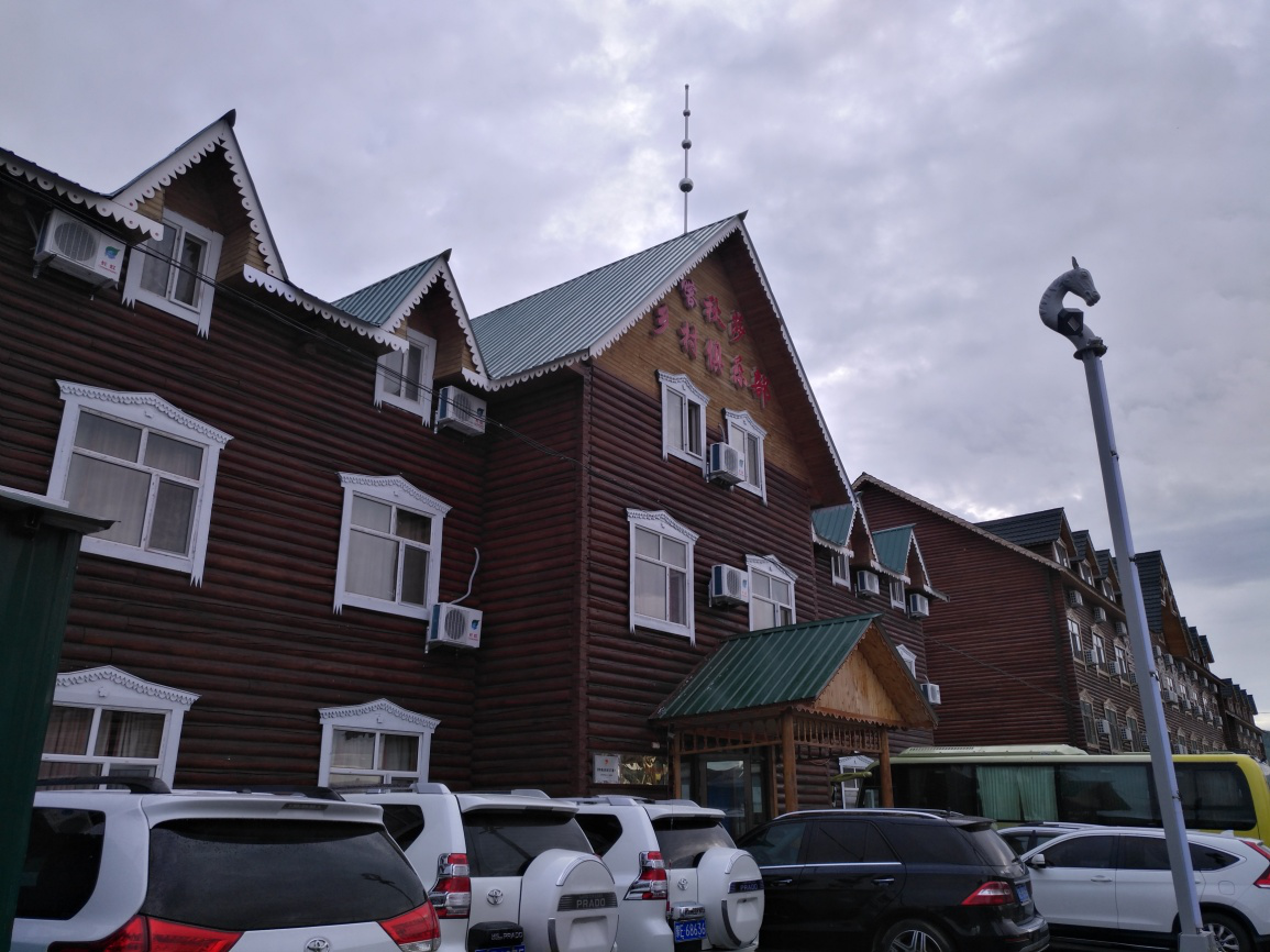 抵達極具異域風情的室韋小鎮。這天入住的酒店樣子有點奇怪:全木制結構的“木刻楞”房子,看樣子很環保;唯一不足的就是隔音效果不太好,鄰間用水的嘩嘩聲聽得一清二楚。晚上會不會再有被呼嚕聲吵醒的問題,我著實有點擔憂。