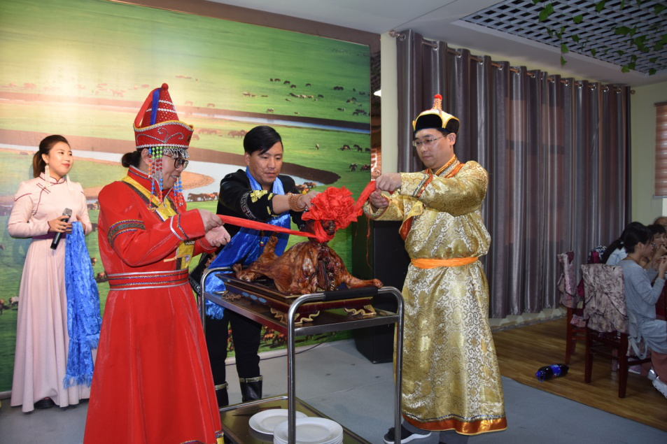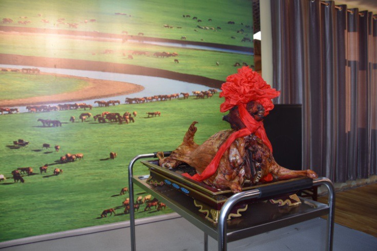 被隊友坑了一把,愣是穿了一回生平從未穿過的怪異民族服裝。我上臺在羊背上劃了一個十字刀,說是寓意著十全十美;又用無名指沾了酒杯中的酒向上彈一下,再向下彈一下;祭完天后,將酒一飲而盡。儀式結束,可以開始吃嘍!